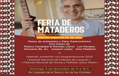 Este domingo 5 de diciembre en la edición de fin de años de la Feria de Mataderos, se presentará Peteco Carabajal & Riendas Libres, además de una importante cantidad de artistas populares, entre ellos Los Pampas, Danzares de Buenos Aires, Joaquín López y Vero Marjbein, en el marco del festival folclórico que todos los domingo tiene lugar en la esquina Lisandro de la Torre y Avda. de Los Corrales.