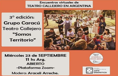 En plena pandemia y en condiciones inéditas, por zoom y bajo la moderación de Araceli Arreche se desarrollará el 3° Encuentro Virtual de Teatro Callejero en Argentina, será el miércoles, la sede prevista no podía ser otra que el Parque Avellaneda que desde los ’90, es un espacio referente y formador de Teatro Callejero. El parque Avellaneda es cuna del teatro callejero siendo casi la mitad de sus Actores Culturales, grupos y actores de teatro callejero, además de ser la sede de formación para la actuación en espacio abierto de la Escuela Metropolitana de Arte Dramático. Con esta motivación, compartimos con todos aquellos interesados en el lenguaje, esta particular convocatoria a un ciclo virtual de encuentros abiertos del teatro de calle. Este miércoles desde las 11 horas comienza el 3° Encuentro Virtual de Teatro Callejero en Argentina con “Caracú Teatro Callejero” el grupo se consolida a partir de 1997 con objetivo de realizar espectáculos ligados al lenguaje de teatro callejero, en espacios abiertos, como una opción estética e ideológica. “Entendemos la apropiación del espacio público como un bien de todos y lo llevamos a cabo con nuestra presencia activa en el barrio, conduciendo actividades culturales que rescatan la memoria colectiva, promoviendo la participación y organización de la comunidad”. Para mayor información y solicitar invitaciones a reuniones virtuales dirigirse a emadteatrocallejero@gmail.com
