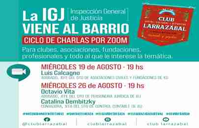 Este miércoles 19 de agosto a las 19 horas, tendrá lugar el primer encuentro del ciclo de charlas “La IGJ viene al Barrio”, ciclo de charlas por zoom, para clubes, asociaciones, fundaciones, profesionales y toda persona interesada en la temática. En el encuentro de hoy estarán presentes Luis Calcagno, Abogado Jefe de Departamento Asociaciones Civiles y Fundaciones del la Inspección General de Justicia, el próximo miércoles 26 en el segundo encuentro del ciclo organizado por el club del barrio de Liniers estarán presentes Octavio Vita, Abogado Jefe del Departamento de Personería Jurídica de IGJ, y Catalina Dembitzky, Contadora Jefa del Departamento de Control Contable de IGJ. Para os interesados a continuación se comparte la información para participar de la reunión