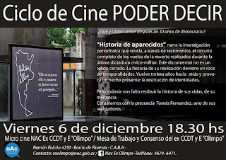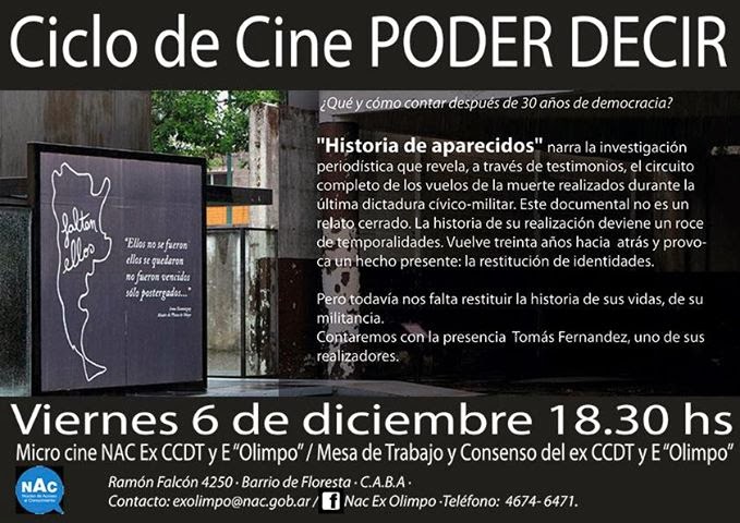 Este viernes 6 de de Diciembre a partir de las 18:30 horas comienza el ciclo de cine “PODER DECIR”. ¿Qué y cómo contar después de treinta años de Democracia. Historia de aparecidos narra la investigación periodística que revela a través de testimonios el circuito completo de los vuelos de la muerte realizados durante la ultima dictadura cívico militar. este documental no es un relato cerrado: la historia de su realización deviene un roce de temporalidades. Vuelve treinta años hacia atrás y provoca un hecho presente: La restitucción de identidades.