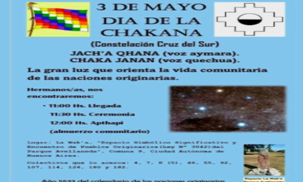 En el marco de una fecha de profundo significado para los pueblos originarios, el próximo 3 de mayo se llevará a cabo en la Ciudad de Buenos Aires una jornada cultural y espiritual para conmemorar el Día de la Chakana, también conocida como la Cruz del Sur en la cosmovisión andina. La actividad propone un espacio de encuentro comunitario centrado en la identidad, la espiritualidad y las tradiciones ancestrales.