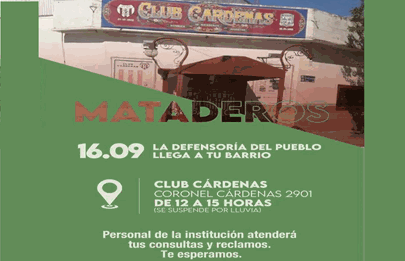 Este jueves 16 de septiembre llega al club Cárdenas del barrio de Mataderos la Defensoría del Pueblo de la Ciudad de Buenos Aires, para brindar sus servicios de información y asesoramiento a vecinos y vecinas de la zona cercana al club de la Comuna 9 porteña. Avda. Coronel Cárdenas 2901.