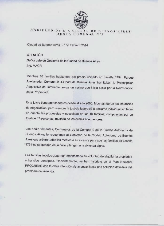 Por Iniciativa de la Comunera Gabriela Martinez del FPV, la Junta Comunal de la Comuna 9, por unanimidad de los presentes en su sesión semanal aprobó acompañar a las 10 familias que pelean por una vivienda digna en Lasalle 1754 del barrio de Parque Avellaneda, además de elaboraron tres notas dirigidas al Juez interviniente solicitando la postergación o suspensión de la medida, otra al Jefe de Gobierno de la Ciudad pidiendo soluciones habitaciones y una ultima a instituto de la Vivienda de la Ciudad (IVC), con el mismo requerimiento.