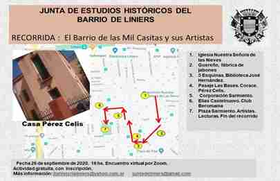 Organizada por Junta de Estudios Históricos del barrio de Liniers, se realizará una recorrida por el barrio de la comuna 9 el sábado 26 de septiembre a las 16 horas, para participar requiere de inscripción previa, es una actividad gratuita. Debido al contexto de pandemia y a las medidas de distanciamiento social impuestas, la recorrida que habitualmente es presencial, ahora será virtual vía zoom. El paseo por el barrio de Liniers denominado denominado “Recorrida por el barrio de las mil casitas y sus artistas”, constará de siete pasos: Partiendo de la Iglesia Nuestra Señora de las Nieves en Ventura Bosch y Martiniano Leguizamón, luego pasando a la ex fábrica de jabones Guereño en la calle Tonelero; el tercer punto del recorrido serán las cinco esquinas a escasos doscientos metros, para llegar luego al pasaje Las Bases, ya en la zona de Mil Casitas, La corporación Sarmiento en Timoteo Gordillo al 400 contará un poco de sus historia; el sexto punto de la recorrida el Centro Cultural Elías Castelnuovo, también se detendrá en el club Beromama, para finalizar en la plaza Sarmiento Cosquin y Tuyutí con una a descripción de artista, relatos y lecturas.