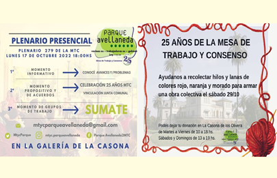 Su encuentro mensual correspondiente a octubre tendrá lugar el día miércoles 26 en la sede de la Asociación Vecinal Florentino Ameghino, ubicada en la calle La Facultad 1772 del barrio de Parque Avellaneda, de acuerdo a lo decidido en la ultima asamblea de este espacio participativo vecinal, para participar es necesario llegar antes de las 18 horas y concurrir con DNI para poder participar de la asamblea y si tenés alguna duda podés comunicarte con la coordinación al siguiente mail: mesacoordinadoraccc9@gmail.com